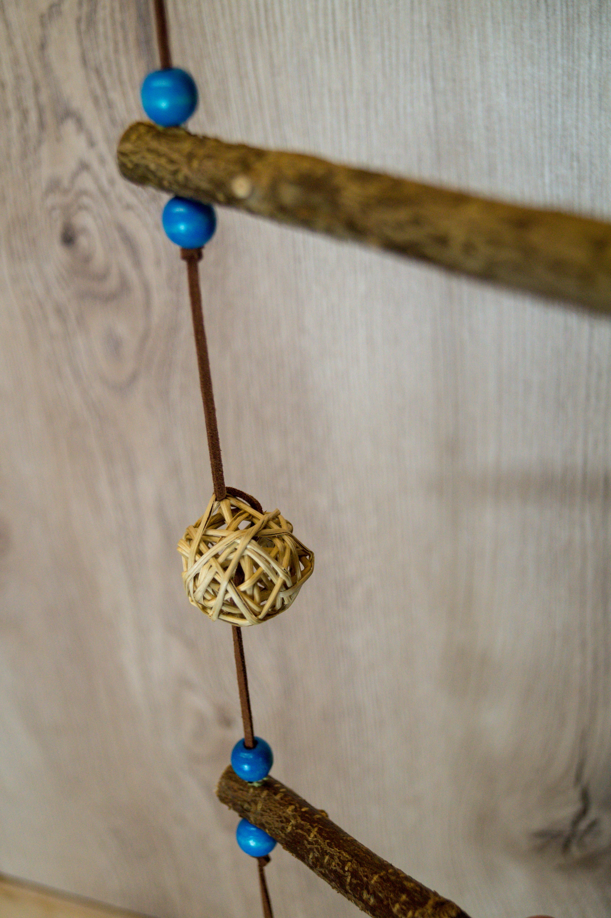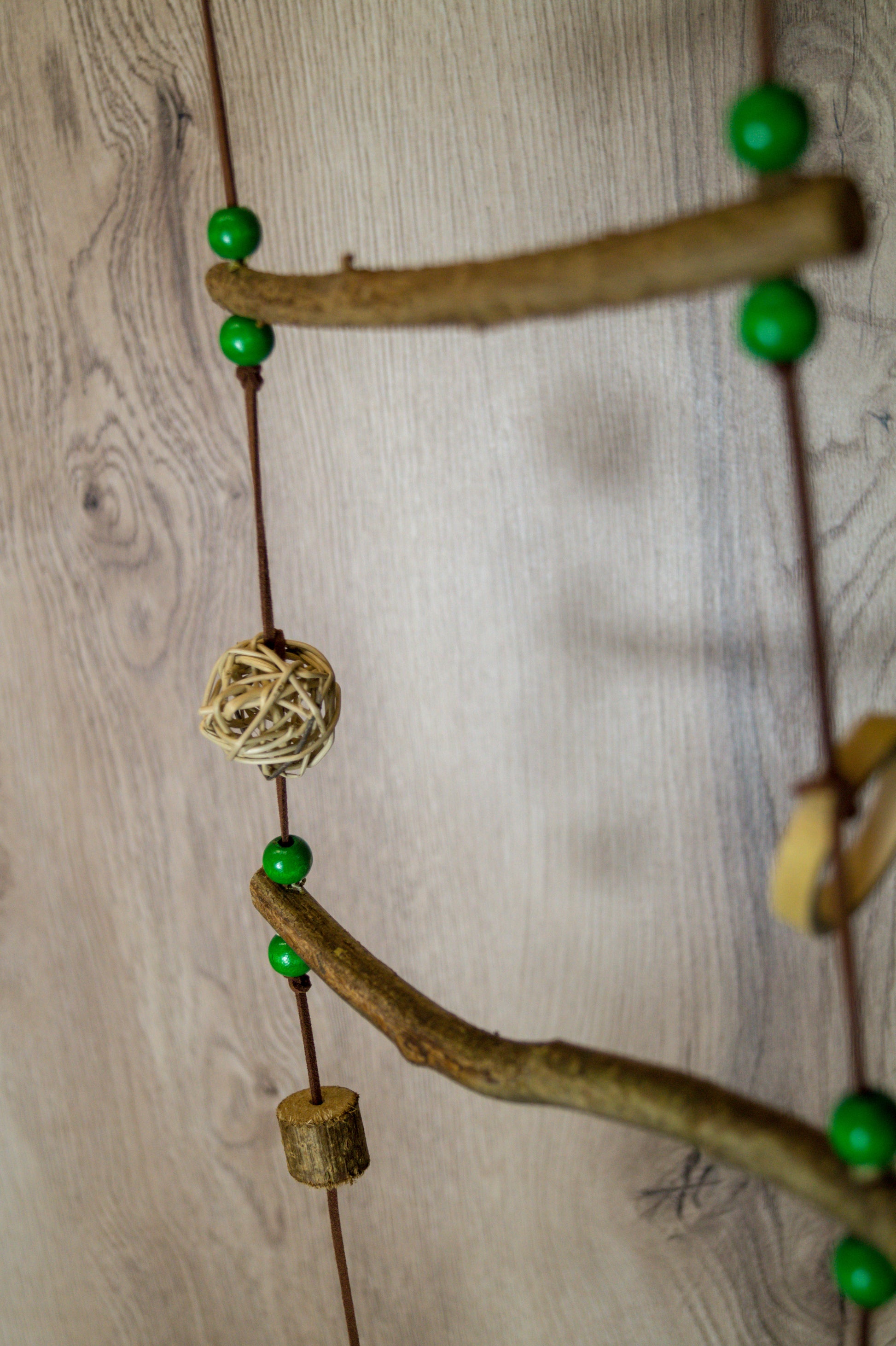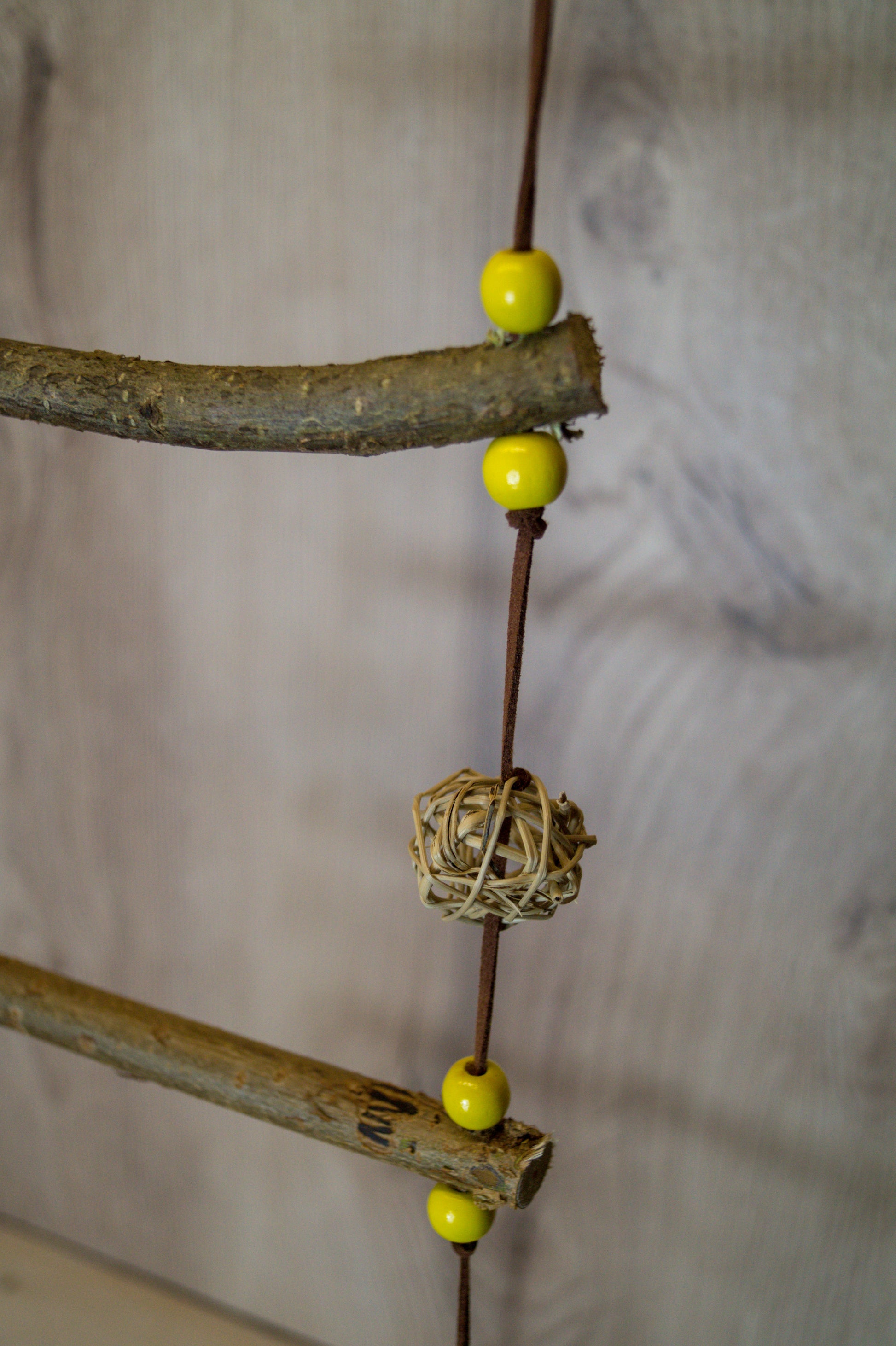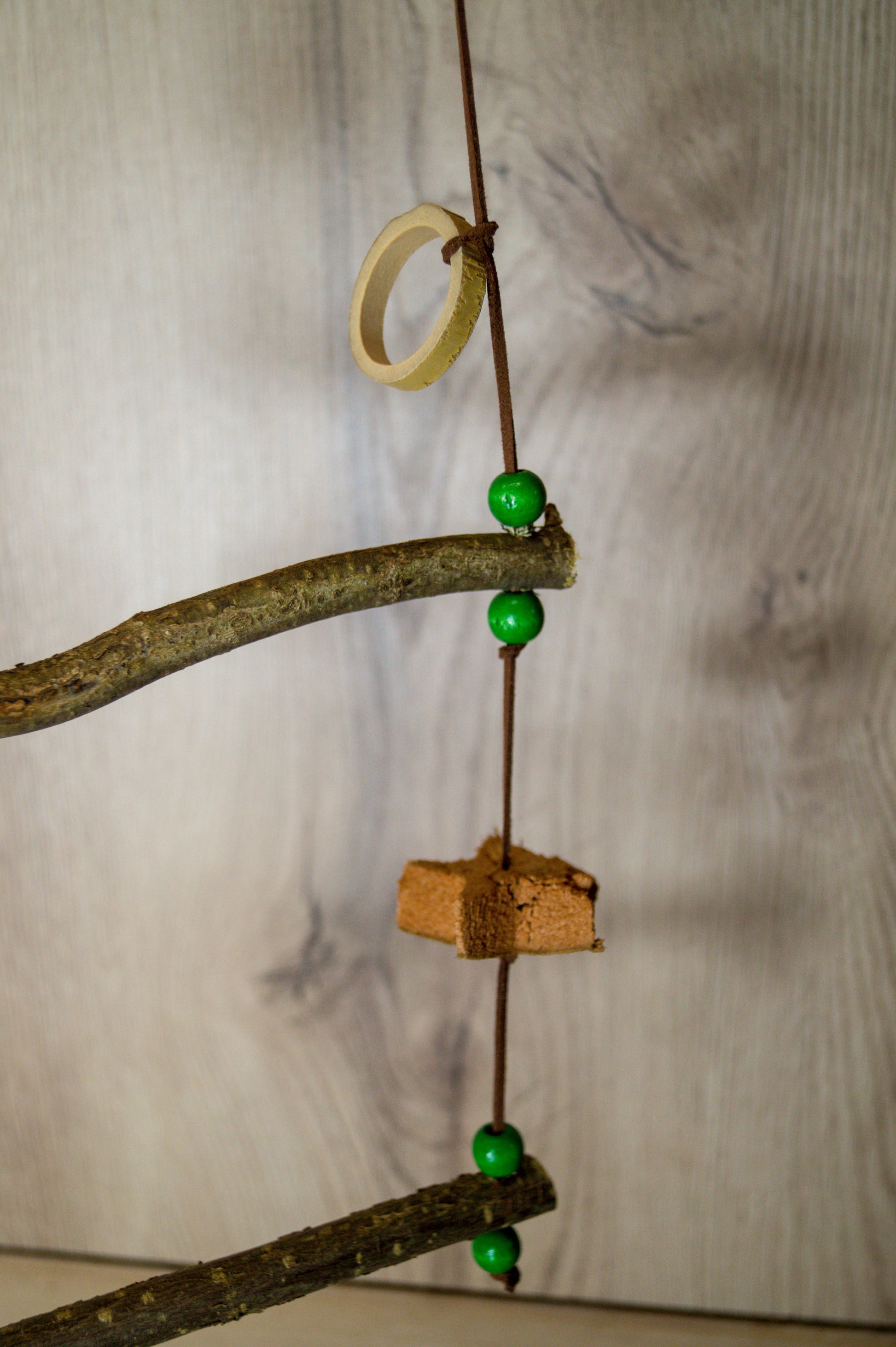 Die Leiter besteht aus natürlichen Holzarten wie Weide, Birke und Obstgehölzen, die eine angenehme Textur bieten und gleichzeitig zur Schnabelpflege beitragen. Da es sich um ein Naturprodukt handelt, kann jede Leiter in Farbe und Form variieren.